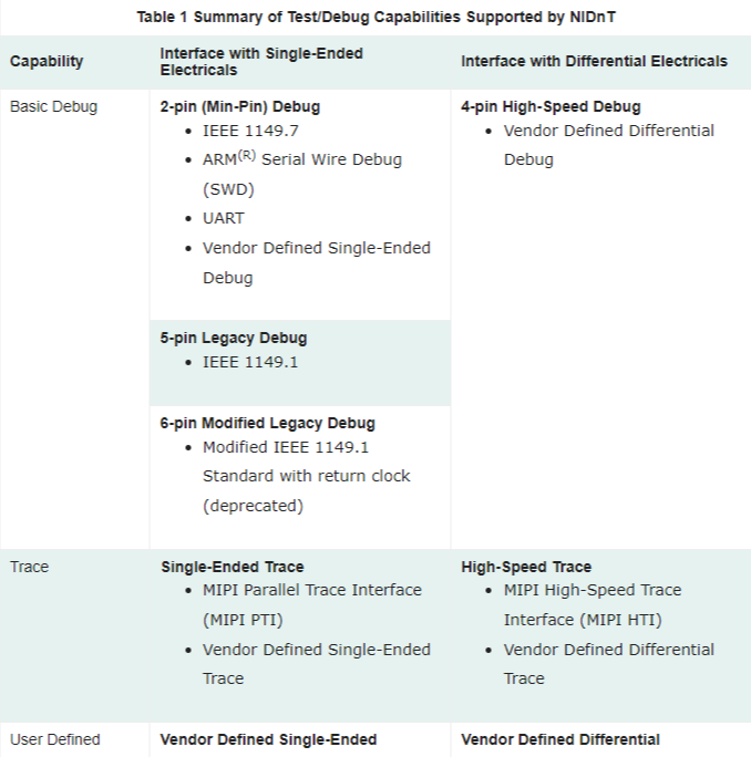 MIPI NIDnT v1.2 is versatile, offering designers the flexibility to perform debug and test over other interfaces that are widely used in mobile and mobile-influenced designs. Interfaces supported by the specification include USB 2.0 Micro-B/-AB, microSD, HDMI and DisplayPort.